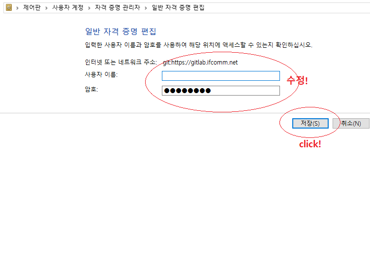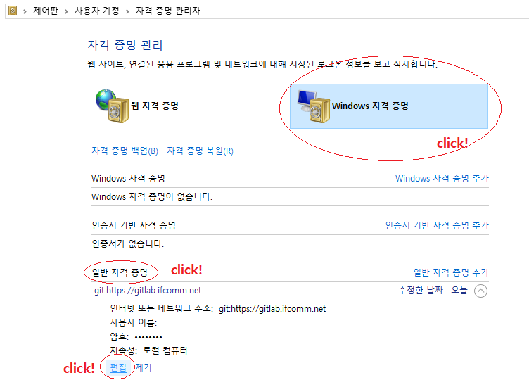 일반 자격 증명 탭에서 문제되는 자격을 선택하여 편집하여 정보를 바꾸거나 제거하여 다시 증명하면 된다.